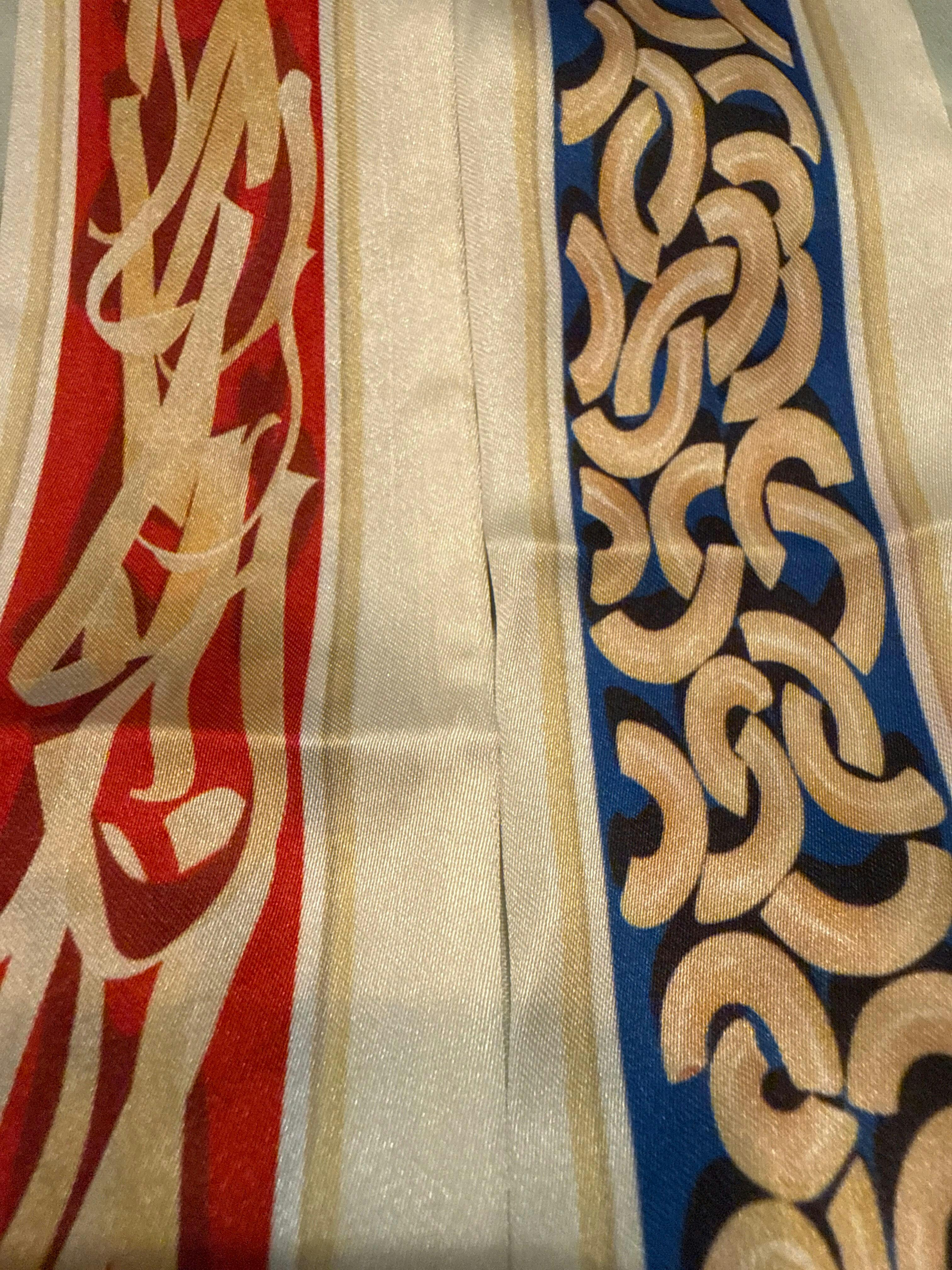 Pasta never looked this good. Our 'Al Dente' skinny scarf features bold blue borders, warm golden noodles, and signature red in a playful, eye-catching design. Versatile and fun, it can be worn around your neck, in your hair, on your wrist, or on a bag, proving that the best designs are sometimes hiding in plain sight.