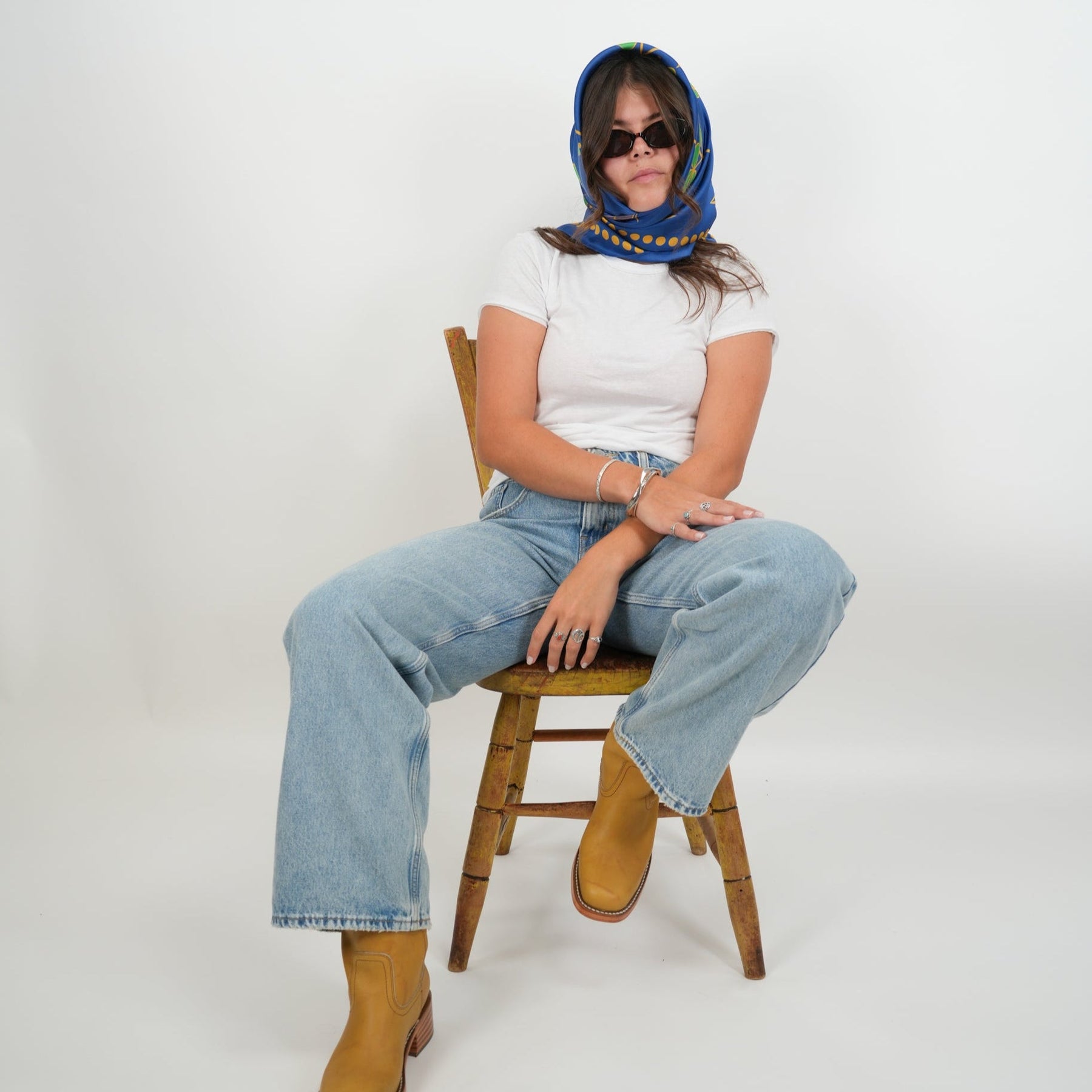 Luck grows in abundance here. Our 'Clover' silky square scarf features vibrant green shamrocks and delicate purple wildflowers winding across a royal blue background with golden vines and a dotted border. Perfect for the optimists and anyone who believes a little luck never hurts.