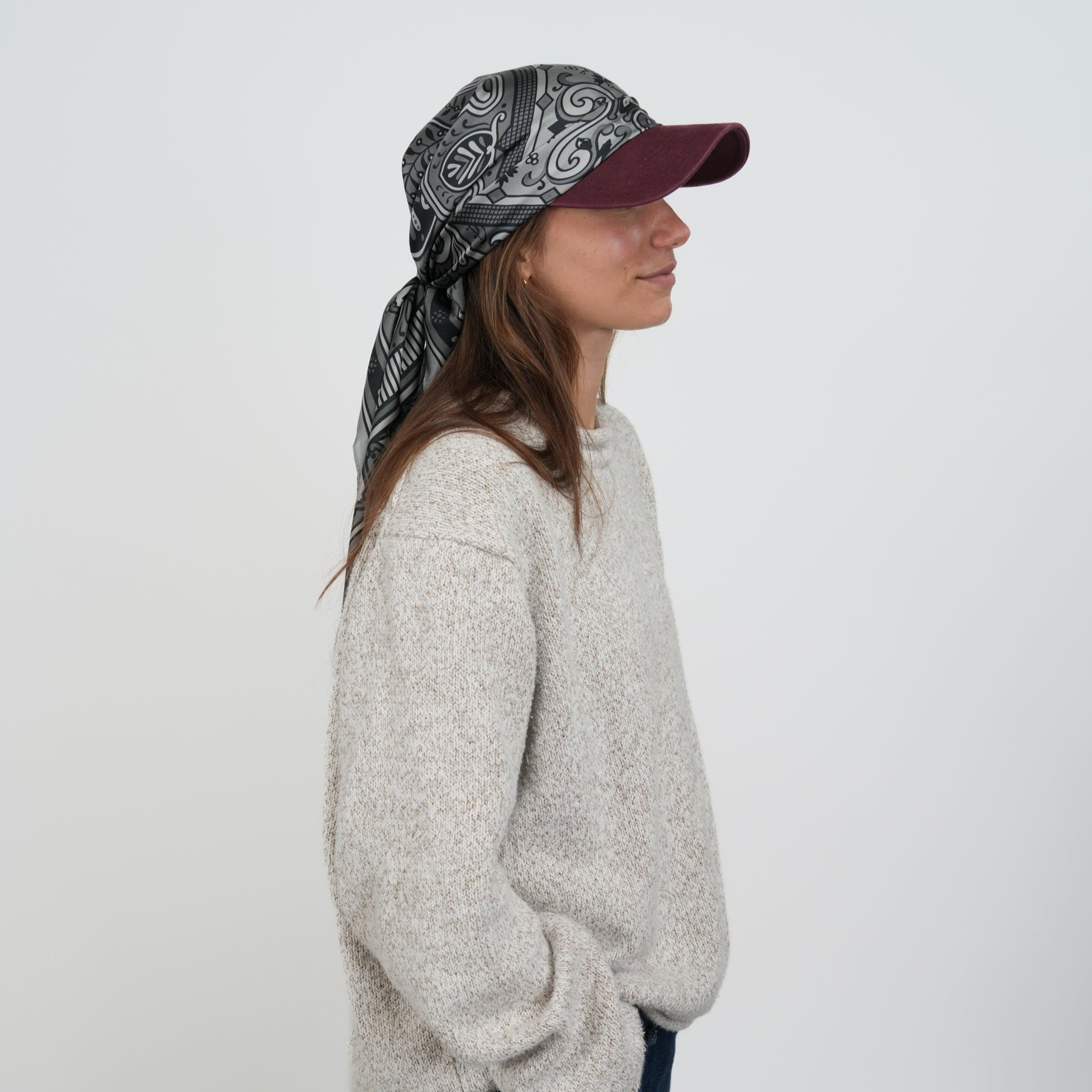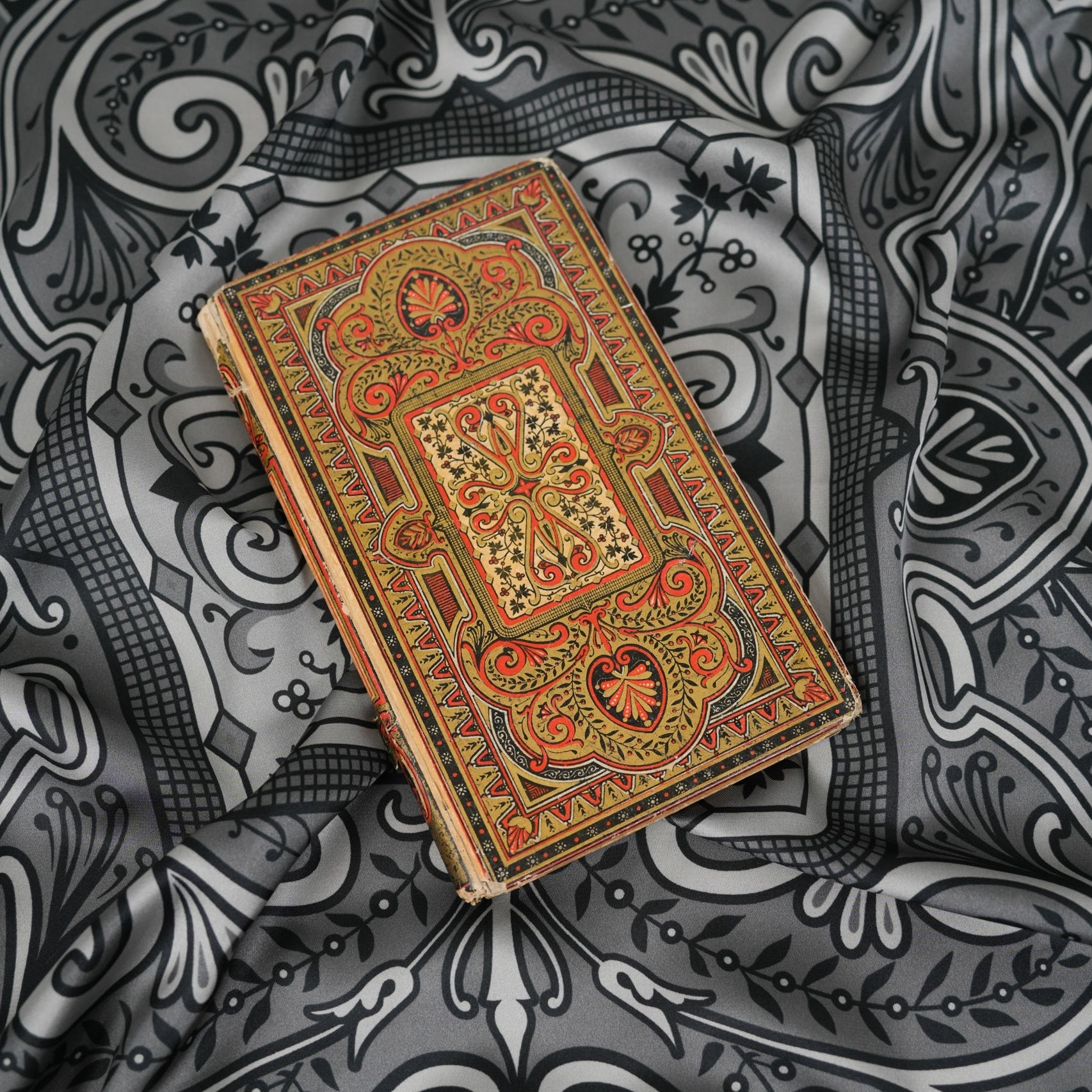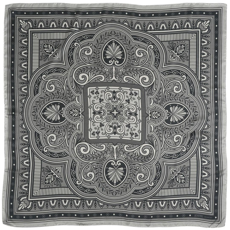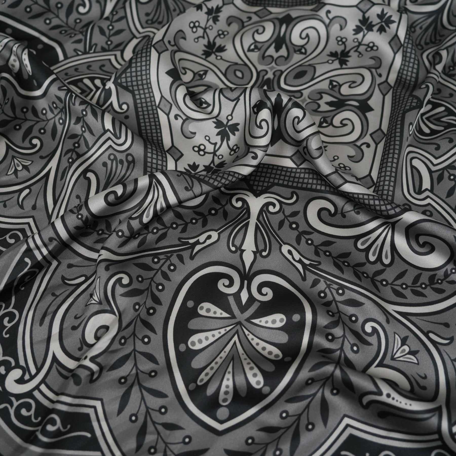 Ornament elevated to art form. Our 'Decoration' silky square scarf features layers of scrollwork, geometric flourishes, and floral motifs radiating from a central medallion in moody charcoal and silver. A pattern that rewards close inspection while making a statement from across the room, it is perfect for anyone who appreciates craftsmanship, symmetry, and the art of ornamental design.