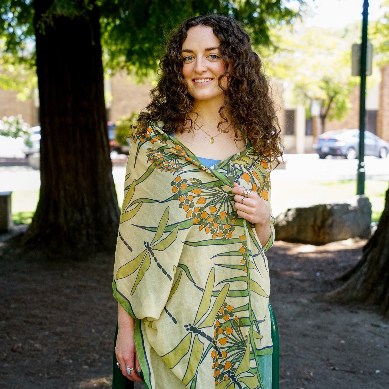 A serene dance of nature unfolds in ‘Dragonfly.’ Graceful dragonflies flutter across a sky filled with earthy tones, weaving among lush grasses with vibrant orange flowers in the foreground. This design captures the essence of tranquility, perfect for adding an earthy touch to your ensamble.