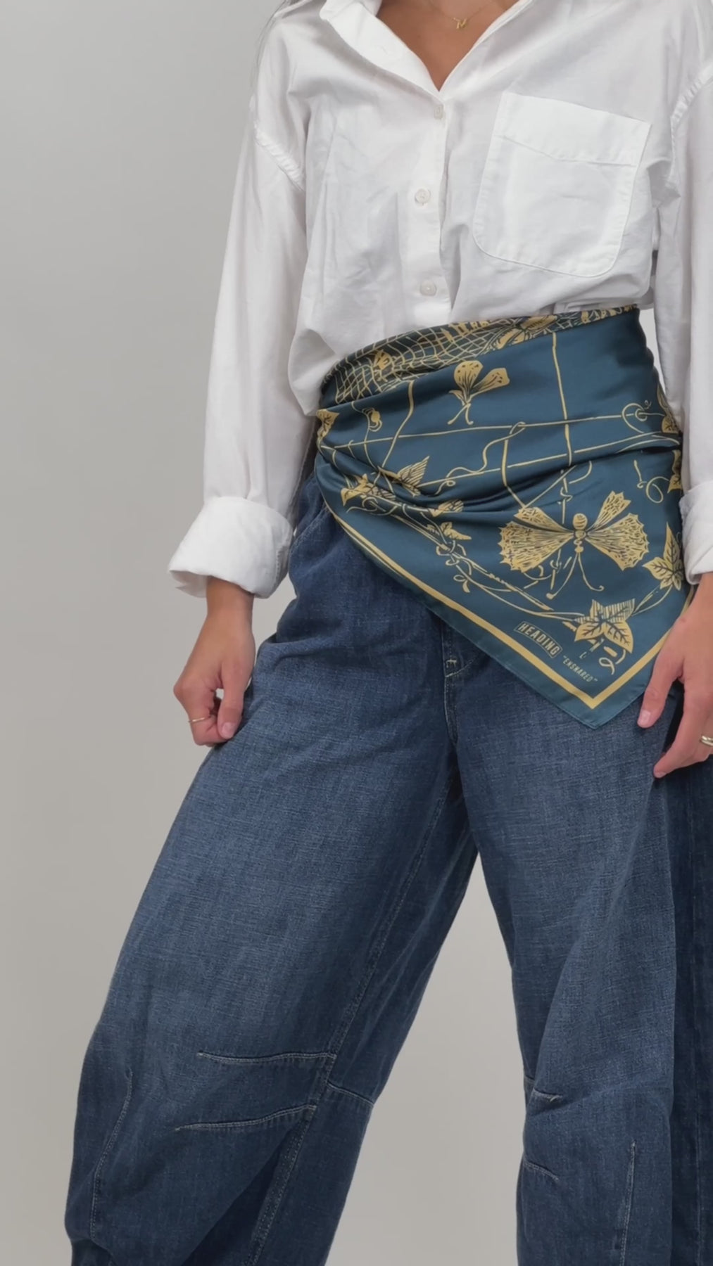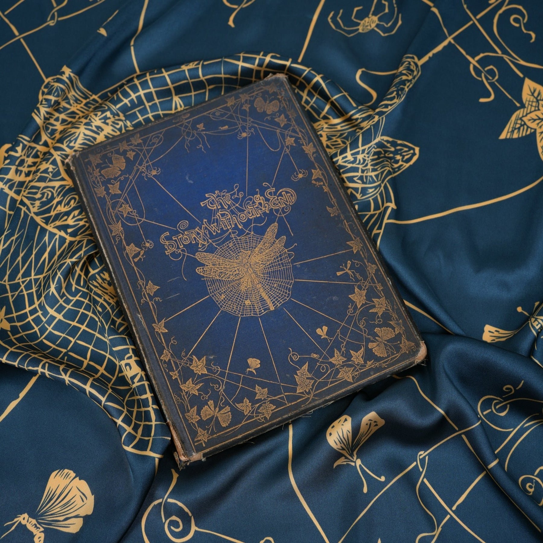 Caught in something beautiful. Our 'Ensnared' silky square scarf features a magnificent dragonfly with intricately detailed wings spread wide, caught in a delicate golden web, framed by climbing ivy vines against a deep teal background. Victorian storybook meets Art Nouveau with a touch of drama and mystery, it is perfect for nature lovers, bookworms, and anyone who delights in the meeting of beauty and melancholy.