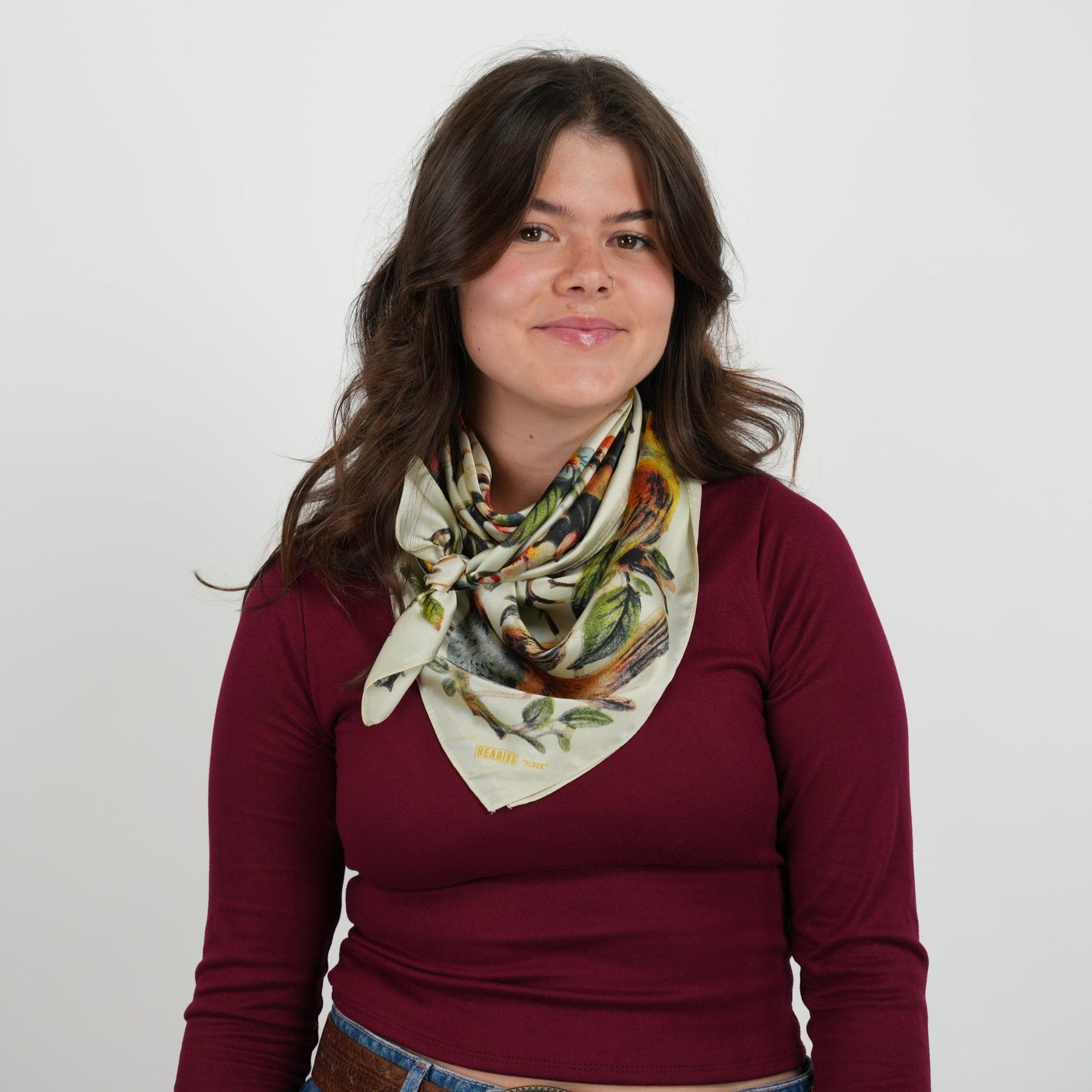 A garden full of song. Our 'Flock' silky square scarf features a riot of tiny songbirds in oranges, yellows, blues, and greens, perched on branches, berries, and leaves against a dreamy cream background. Perfect for bird watchers, nature lovers, or anyone who wishes their backyard felt a little more like BBC Planet Earth.