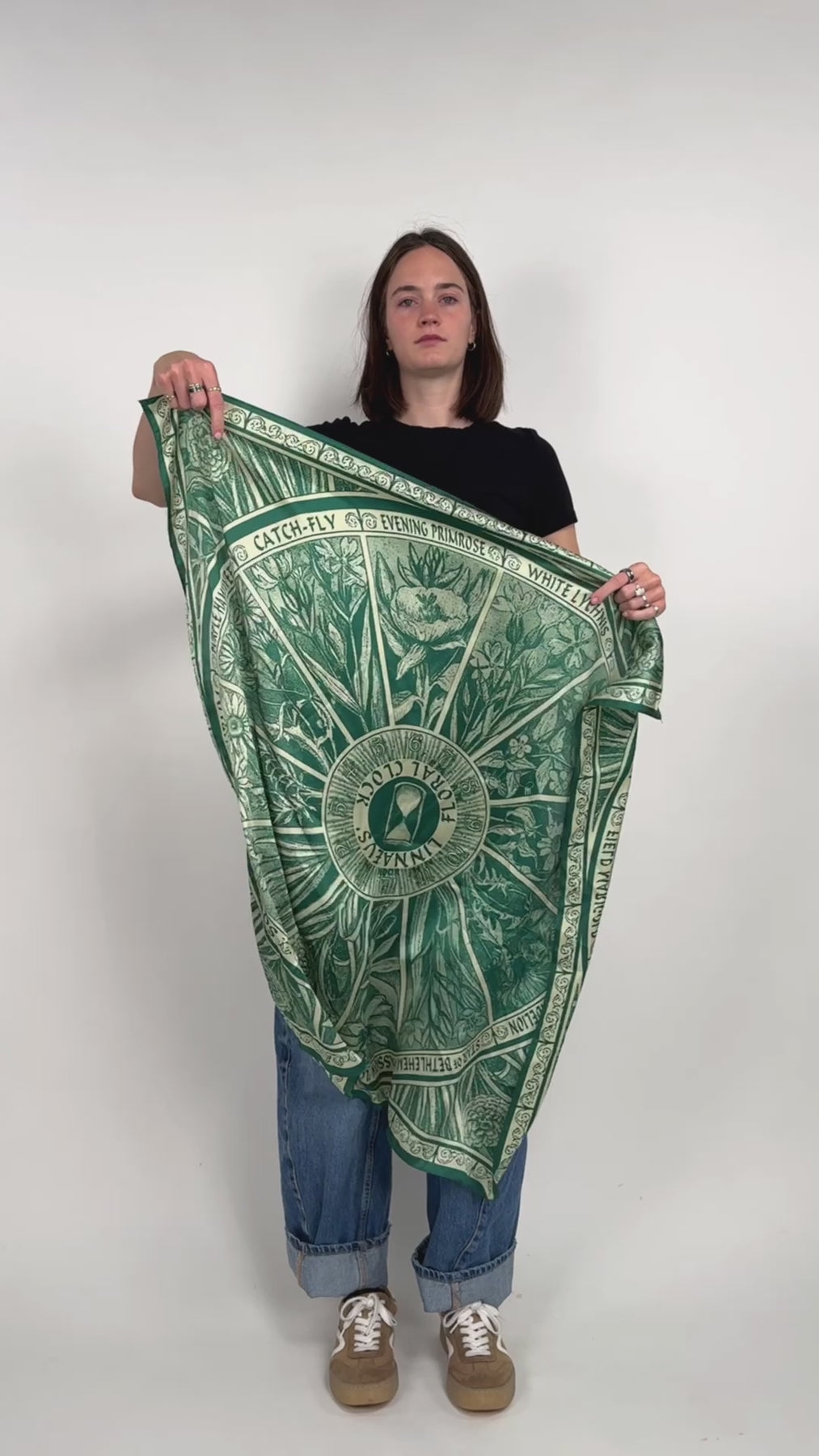 Time told through flowers. Our 'Floral Clock' silky square scarf features a botanical clock with each hour marked by a different flower, illustrated in rich forest green and soft cream. Perfect for gardeners, botanists, or anyone who loves when nature and design come together.