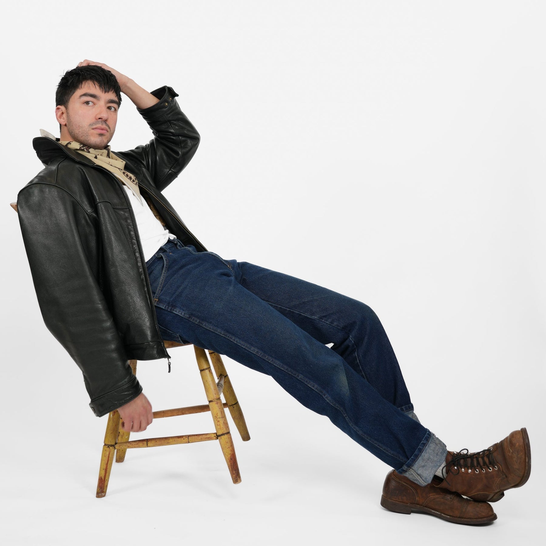 Man wearing a red patterned headscarf against a plain background