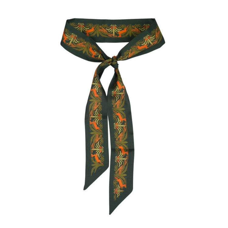 For fox hunters, equestrian enthusiasts, and anyone who appreciates the pageantry of the chase. Our 'Hunt' skinny scarf features leaping foxes amid stylized foliage in vibrant oranges, golds, and greens on a rich forest green background. Bold and spirited, it captures the energy of the hunt with Art Nouveau elegance and makes you want to saddle up for a countryside adventure.
