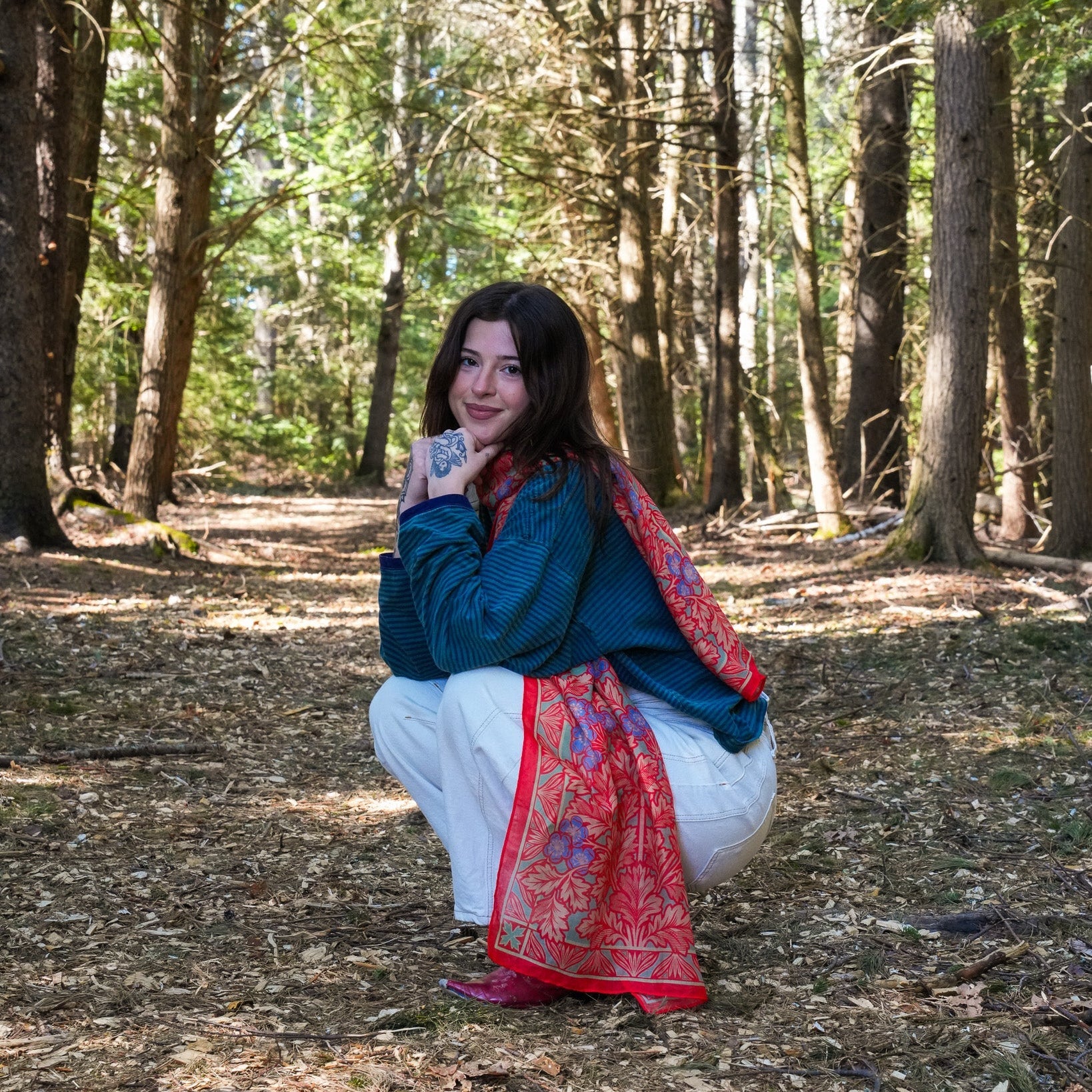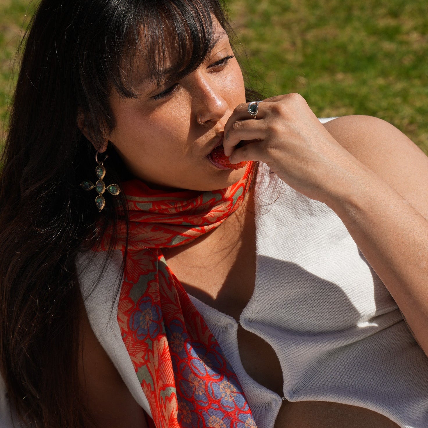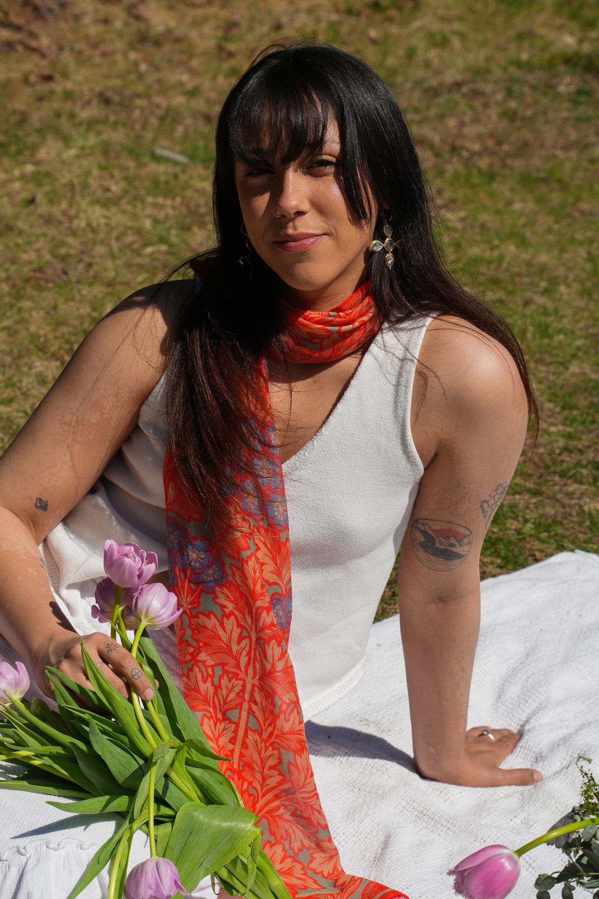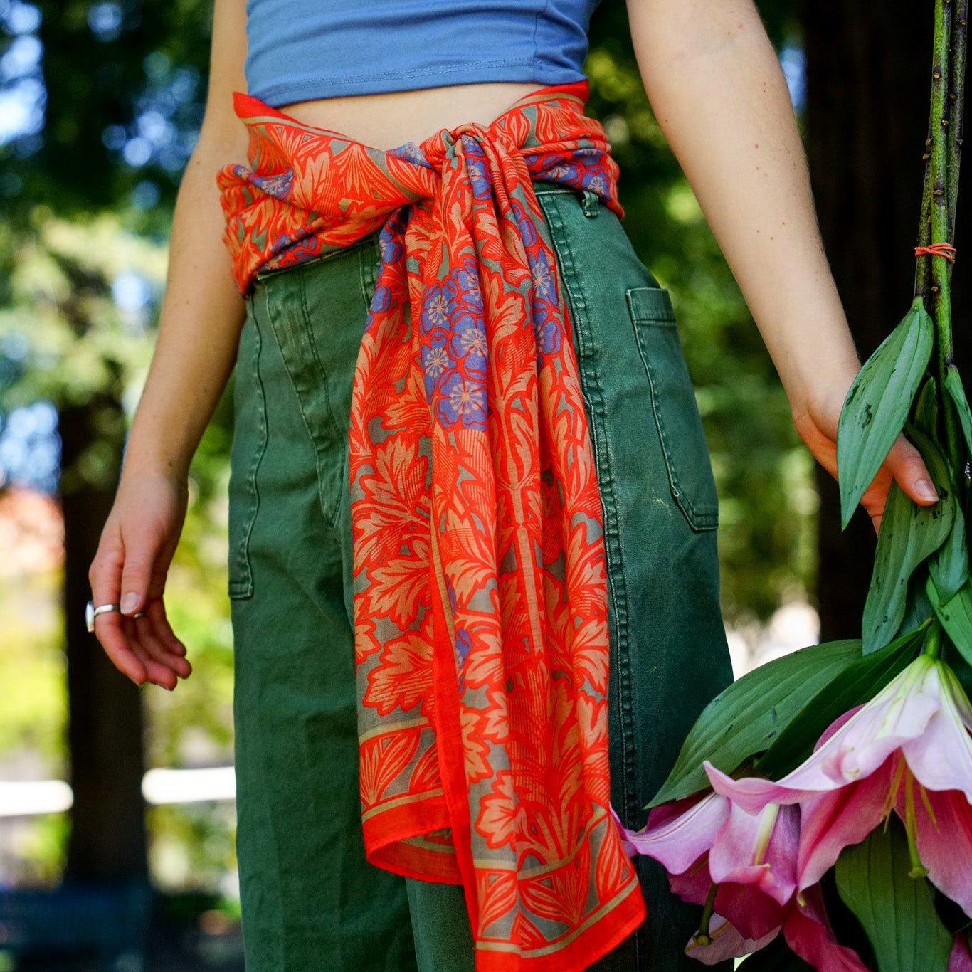 Bright coral fabric blooms to life in our 'Inflorescence' scarf. Scattered bluish-purple flowers and orange leaves create a garden you can wear. This eye-catching piece adds a pop of color to any outfit, from casual to dressy.