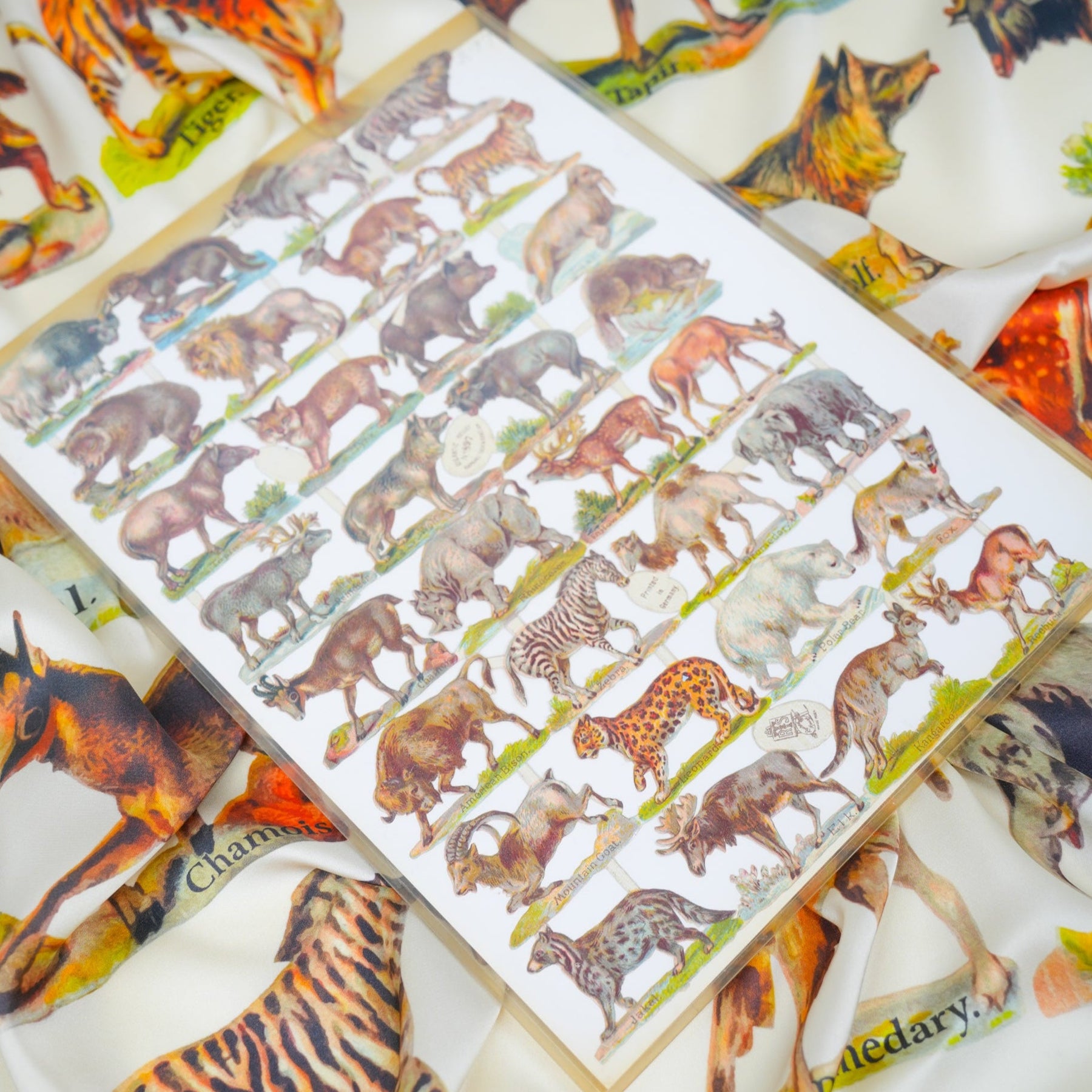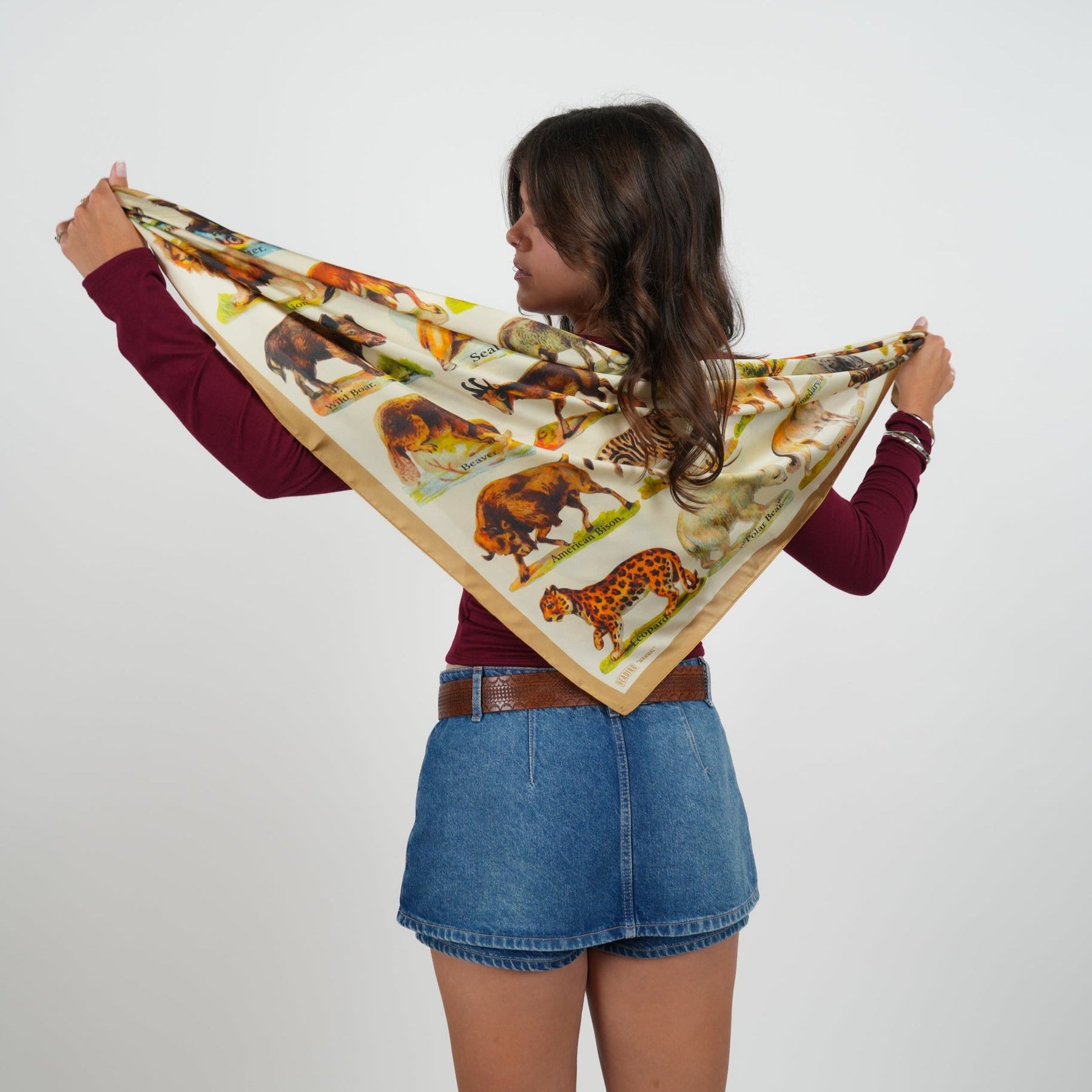 The whole animal kingdom in your hands. Our 'Mammal' silky square scarf features thirty diverse creatures, from bison and tigers to elephants, seals, mountain goats, and leopards, all arranged in neat rows and rendered in rich, natural tones against a cream background with a warm tan border. It is perfect for animal lovers, zoo enthusiasts, educators, or anyone who ever collected animal cards or stickers as a kid.