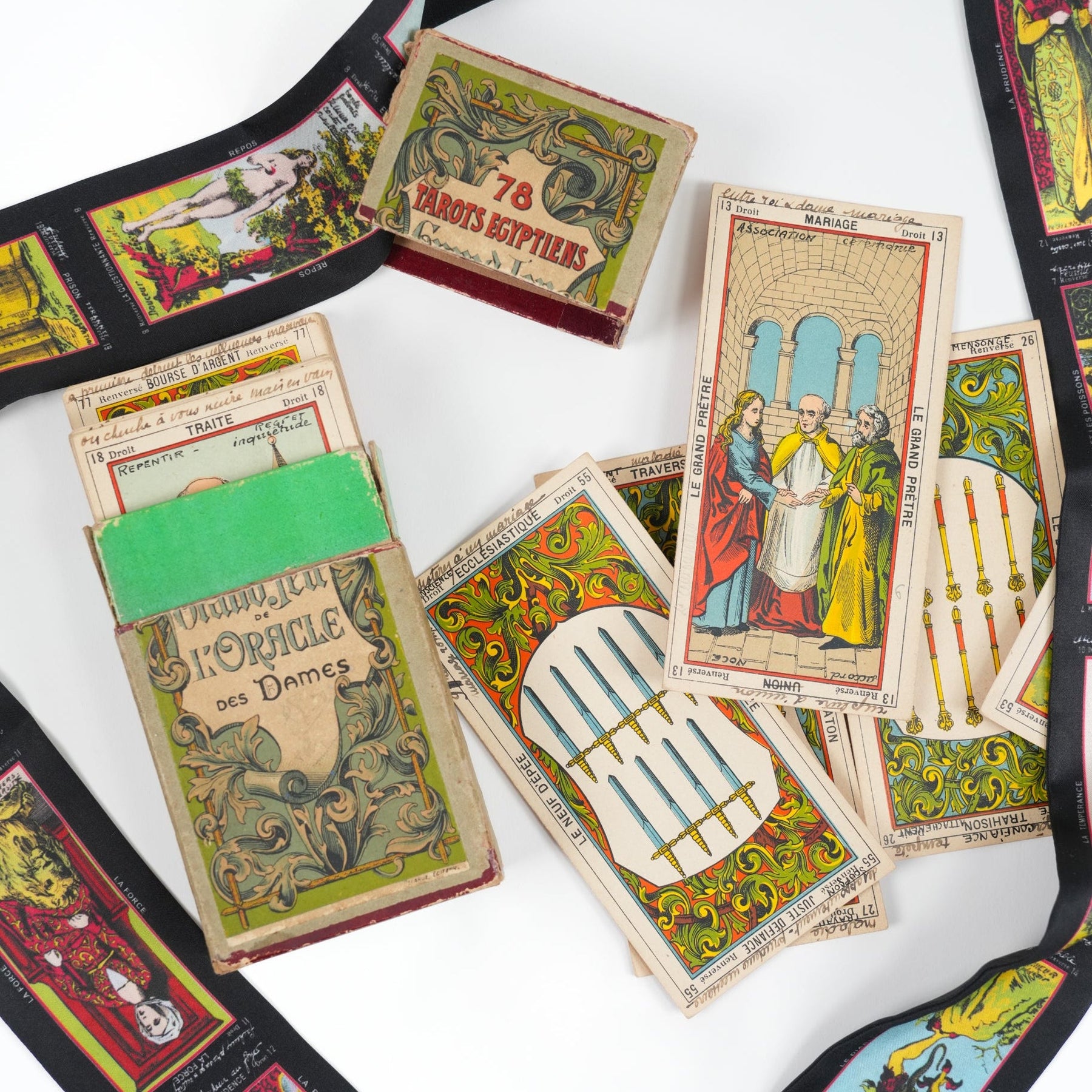 For the tarot readers, the fortune tellers, and anyone who's ever felt drawn to the mystical. Our 'Premonition' skinny scarf features vintage oracle cards arranged in neat frames against a deep black background—each one illustrated in rich, symbolic detail with figures, scenes, and archetypes in soft pinks, yellows, greens, and blues. It's like wearing a fortune-telling deck around your neck.