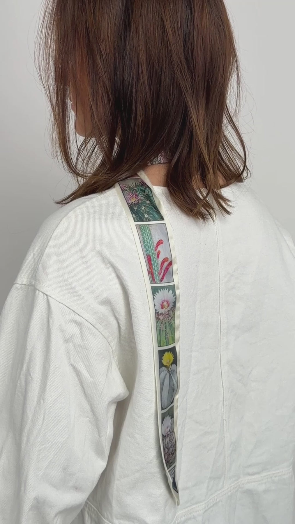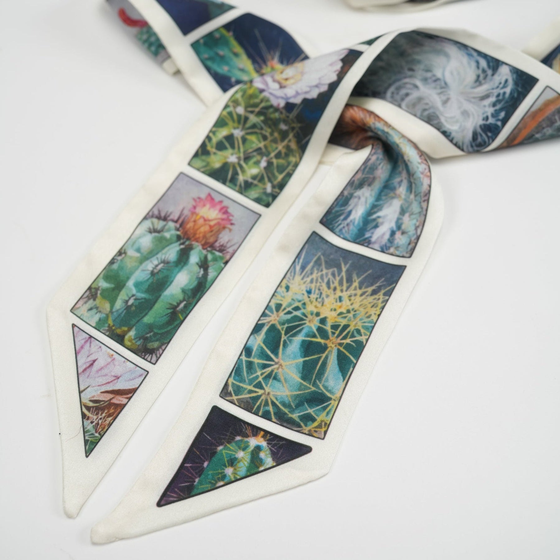 For the desert dwellers, the succulent collectors, and anyone who finds beauty in tough plants. Our 'Prickly' skinny scarf features a collection of cacti in full bloom—spiny barrels, night-blooming cereus, prickly pears—each one photographed in vivid detail and arranged in neat rectangular frames against a soft cream background. Greens, pinks, whites, and the occasional pop of coral capture these desert survivors at their most spectacular.