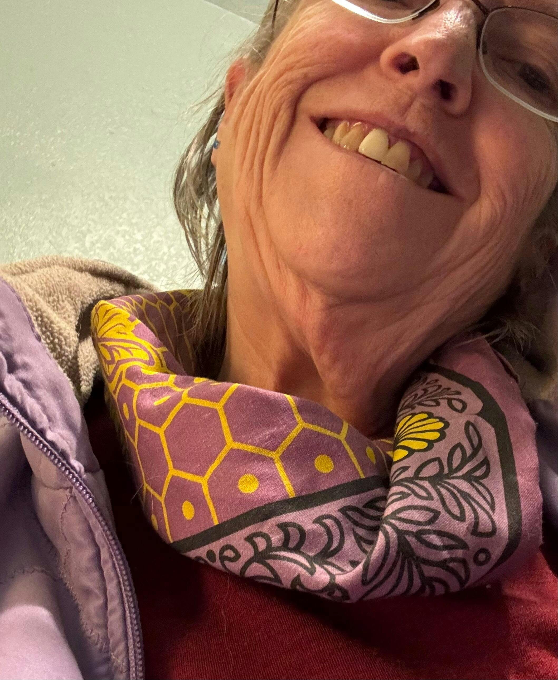 Man wearing a red patterned headscarf against a plain background