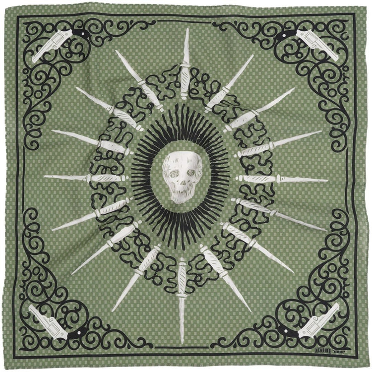 Meet 'Revenge'. This bandana pulls its dramatic flair straight from an 1896 book of the same name, and it doesn't mess around. The skull-and-daggers design radiating from the center has serious Victorian gothic energy, complete with ornate scrollwork that frames the whole thing perfectly. There's something undeniably cool about the way those pistols sit in the corners, and that sage green background keeps it from feeling too heavy or theatrical. It's got edge without trying too hard, and the vintage illustration style gives it authentic character you can't fake.