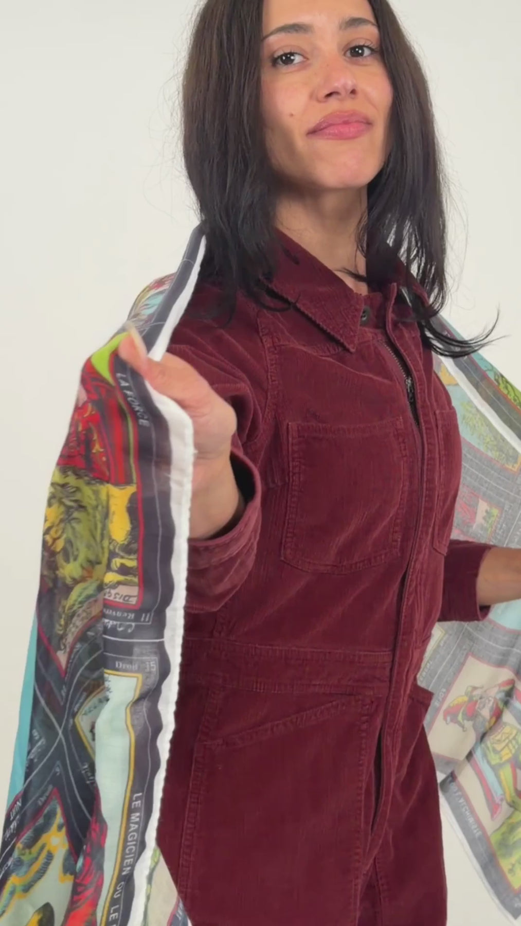 Let your future unfold around your shoulders with 'Tarot'. This conversation-starter scarf features a colorful grid of mystical cards, each with its own detailed illustration and title. The vintage-inspired designs pop against their black borders, giving you that perfect blend of fortune-teller vibes and fashion-forward style. Pair it with something simple and let this piece do all the talking.