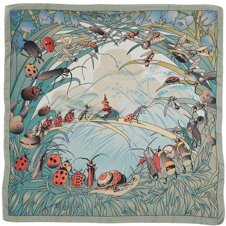A bug's-eye view of the world. Our 'Tom Thumb' silky scarf features beetles, bees, and other tiny friends weaving through giant grass and flowers in dreamy, slightly faded blues. Soft, a little bit extra, and endlessly versatile, it can be worn around your neck, as a headscarf, looped through your bag, or even framed as art.