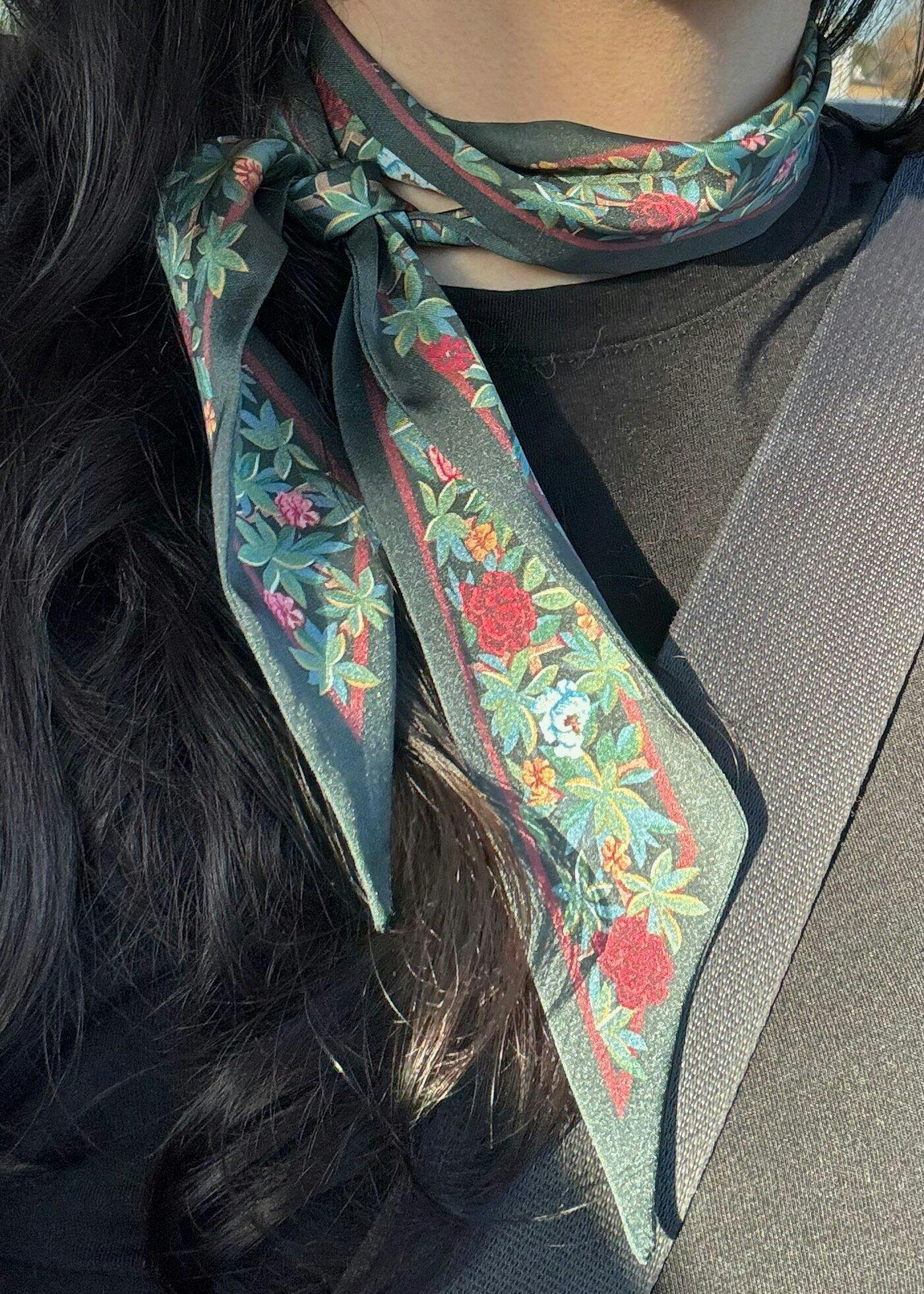 This narrow silhouette adds a pop of pattern without the bulk, perfect for layering under jackets or knotting at the neck for a subtle statement.