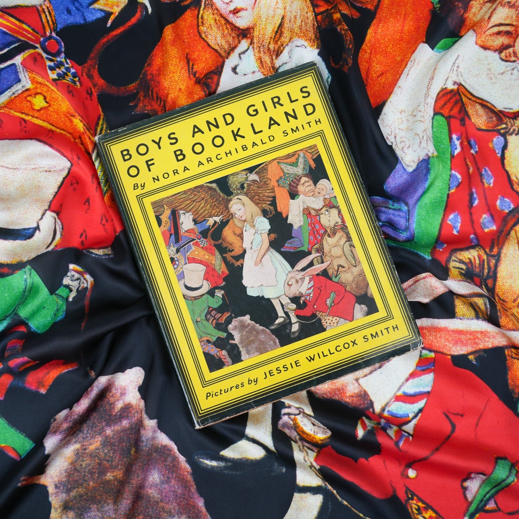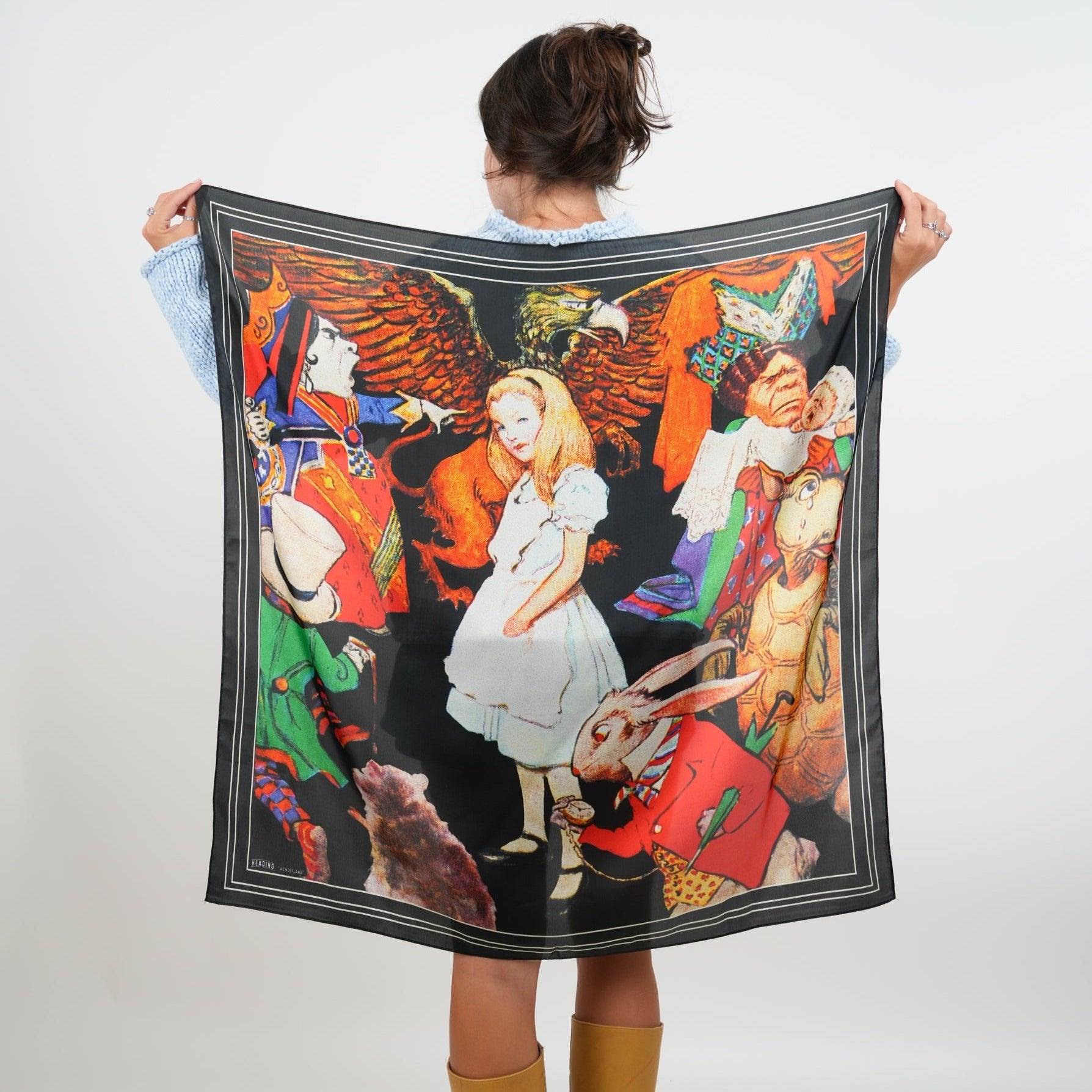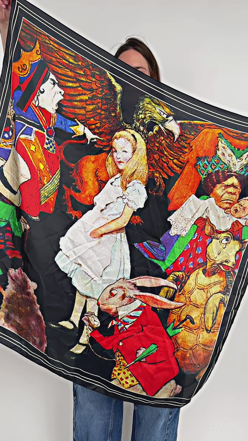 Down the rabbit hole and onto your neck. Our 'Wonderland' silky square scarf features Alice in her iconic white dress surrounded by her chaotic crew, with bold colors that pop against a deep black background for a dramatic, theatrical feel. Vibrant, detailed, and unapologetically colorful, it is perfect for book lovers, dreamers, and anyone who has ever felt a little too curious for their own good.