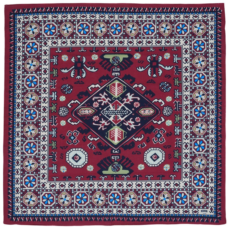 This is 'Woven'. This bandana captures the intricate beauty of traditional carpet design, pulled from a 1903 Japanese textile reference called "Sekai Sarasa All." The level of detail here is incredible—layers of geometric borders framing a central medallion that draws your eye right in. It's the kind of pattern that rewards a closer look, with symbols and motifs that have been passed down through generations of craftspeople. The rich burgundy and blue palette gives it serious vintage appeal without feeling dusty or old-fashioned.